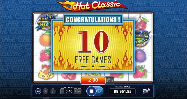 Hot Classic™ video slot have 5-reels, 4-rows and 40 paylines. At least 3 Scatter symbols will trigger 10 Free Spins. The video slot features also Wild Symbol, Gamble Game Mode and Autoplay.