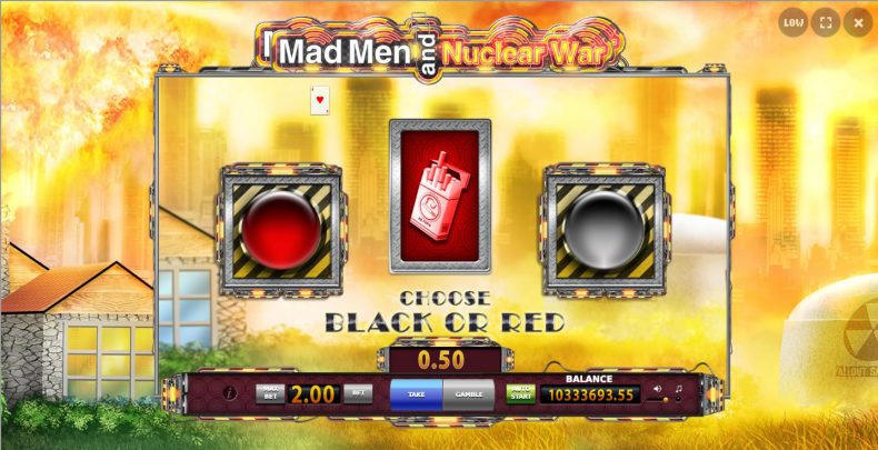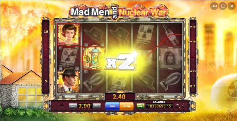 Mad Men and Nuclear War™ video slot have 5 reels, 3 rows and 20 paylines. Slot game features Wild symbol, Scatter Symbol, Free Spins and Gamble Mode.