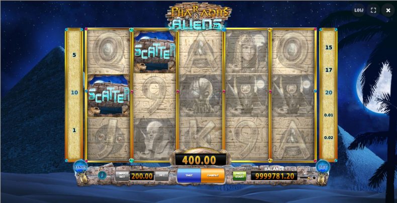 Pharaohs and Aliens™ video slot have 5 reels, 3 rows and 10 winning lines. 3 Scatter symbols trigger 15 Free Spins at x3 multiplier. Wild symbol substitutes all symbols except Scatter. Slot game features Gamble Mode.