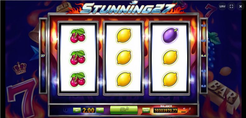 Stunning 27™ video slot have 3 reels, 3 rows and 27 ways to win. All 4 Fruits symbols are Stacked symbols. If 9 identical symbols land on reels, your winning is tripled (multiplied by x3).